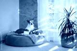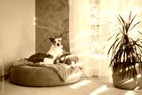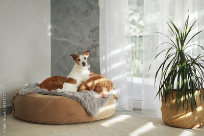 A Jack Russell Terrier sits confidently beside a relaxed retriever on their shared pet bed.