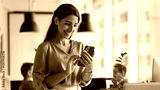 Happy beautiful Hispanic businesswoman using web service on smartphone in office workspace, working on online project on mobile phone, typing on cellphone, smiling. Banner shot