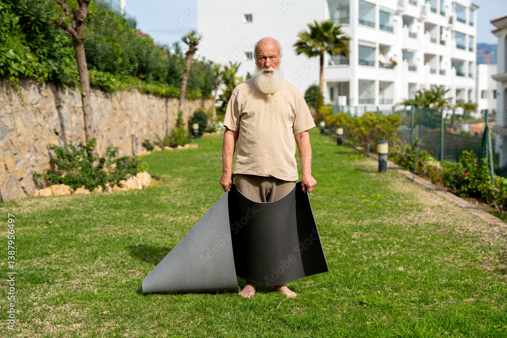 Elderly man preparing yoga mats in the garden for yoga practice