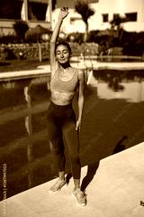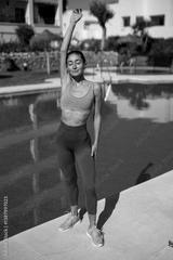 Woman stretching with one arm raised, standing near the pool in activewear and sneakers