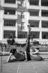 Side leg raise exercise on yoga mat, fitness workout outdoors by the pool..