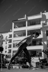 Woman stretching and performing a dynamic lunge exercise outdoors in activewear