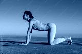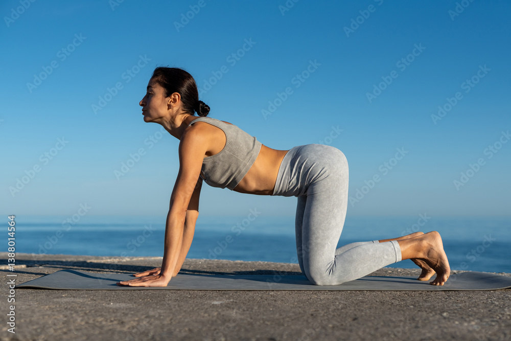Young woman performing cat yoga pose outdoors near the sea, wearing gray fitness attire, promoting health, flexibility, and mindfulness under a clear blue sky