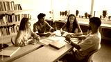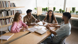 Successful collaboration in learning. Friendly young students mates from different ethnic groups meet on workshop training at library or classroom share ideas discuss project during peer study seminar