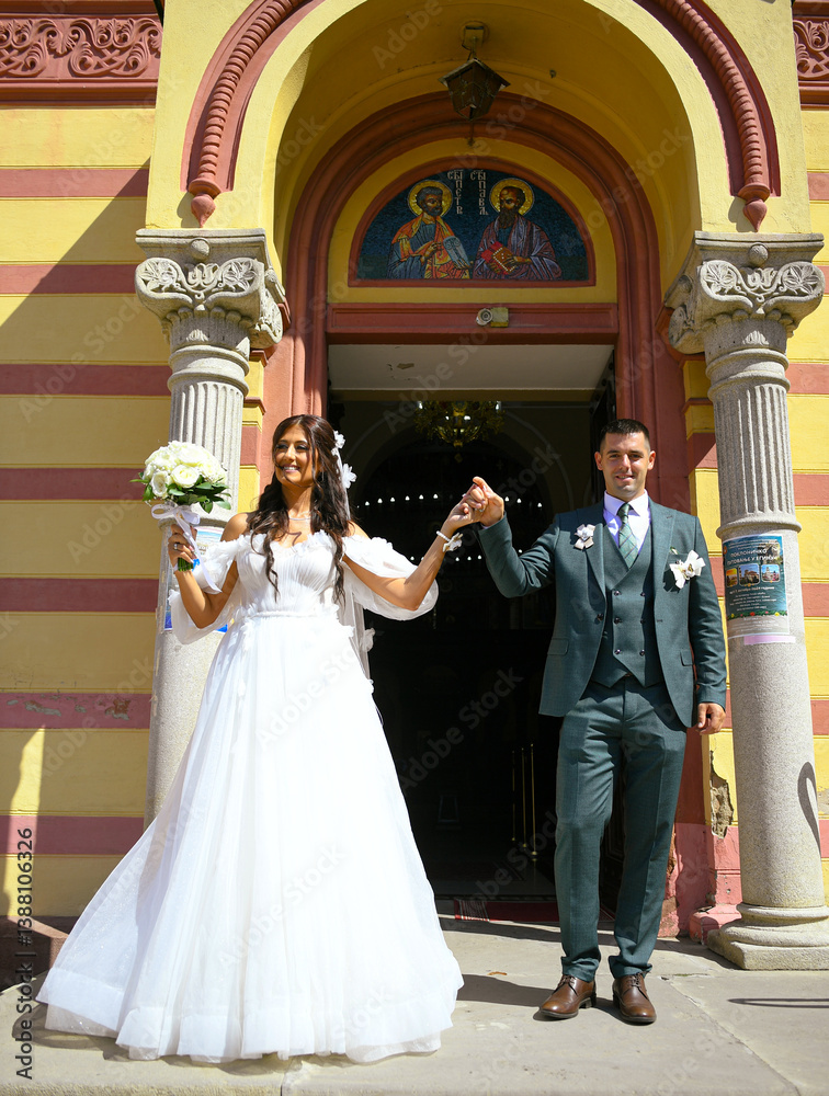Just married couple standing in front of a church with raised hands, holding each other’s hand in celebration. Traditional church wedding ceremony.