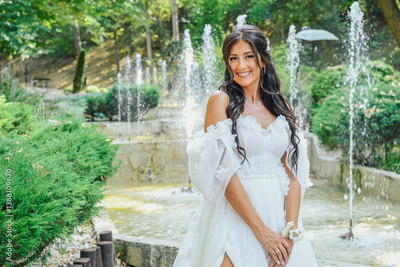 Smiling bride in a white dress stands in beautiful romantic scenery, enjoying a peaceful moment. Natural background.