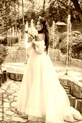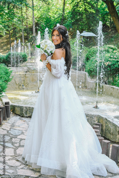 Portrait of a smiling young woman in a white wedding dress, standing in a beautiful romantic setting and enjoying a peaceful moment. The bride is holding a bouquet of white roses.
