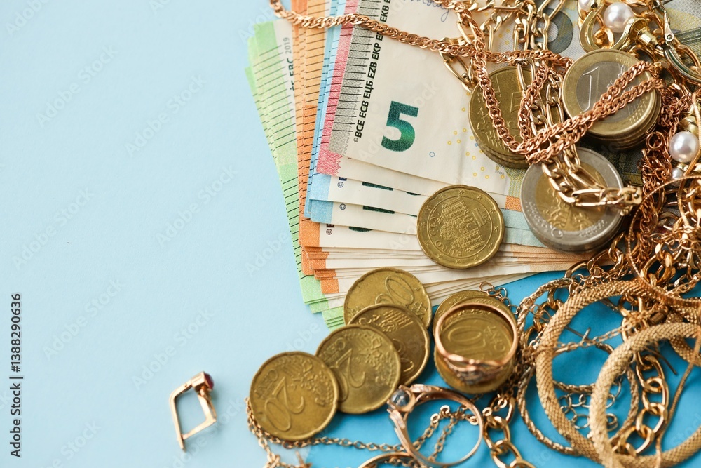 European union Euro money bills and coins with golden rings and jewelry necklaces on blue table