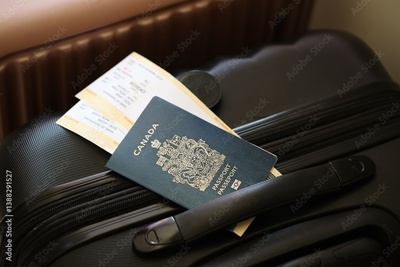 Canadian passport with tickets lies on touristic suitcase in airport hall