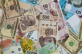 Big amount of money bills of different currencies and countries. Assortment background of international cash in big pile close up