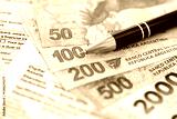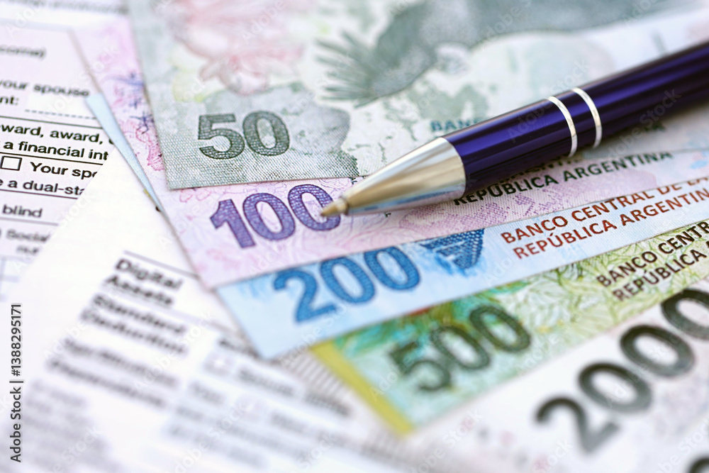 Argentine pesos money bills in big amount lies on table with pen and tax forms close up