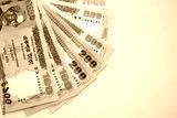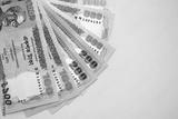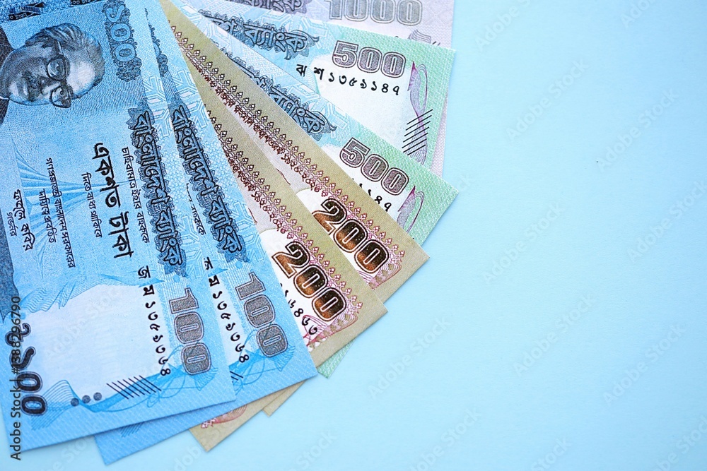 Bangladeshi taka money bills in big amount lies on teal color table close up