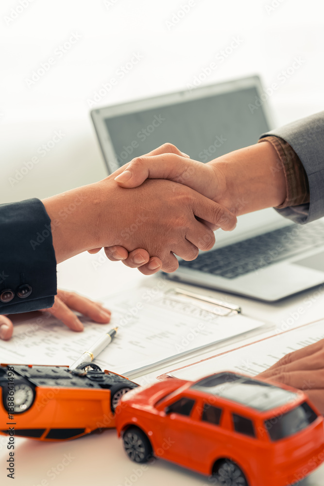 Insurance agent and customer shake hands after signing contract. Car insurance concept. Sales manager offers car sales and explains terms of signing car and insurance contract.