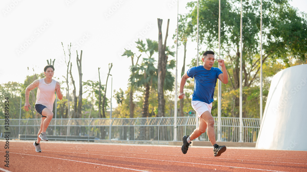 Blue shirt asian athlete man is running in front of a man in white tank top on the racetrack.