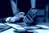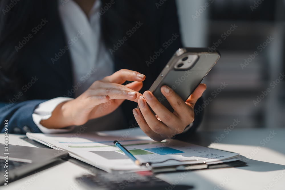 Businesswoman browsing on smartphone and analyzing financial charts, working with documents, laptop and calculator in modern office, close up on hands