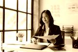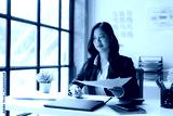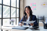 Young businesswoman reviewing paperwork and analyzing financial data while sitting at her desk in a modern office, demonstrating professionalism and focus in her work