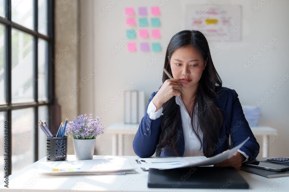 Young asian businesswoman holding pen and reading documents, analyzing charts and graphs while sitting at her desk in modern office, thinking and making notes about new project