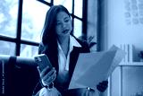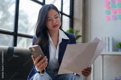 Young asian businesswoman sitting on sofa and comparing data between smartphone and documents, working and managing her business in modern office