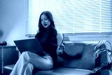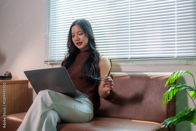 Young asian businesswoman sitting comfortably on a sofa, using a laptop and holding eyeglasses, engaging in remote work from her bright and serene home office