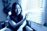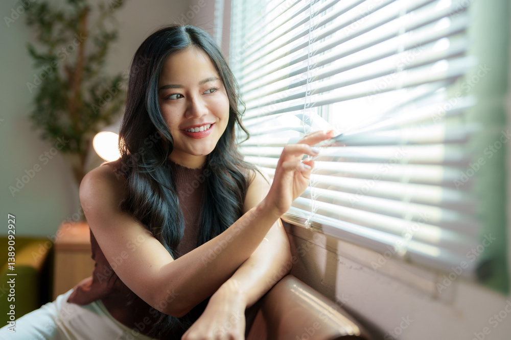 Smiling young woman opening venetian blinds, gazing out the window in her modern apartment, soaking in natural light and enjoying a beautiful view of the morning sunshine