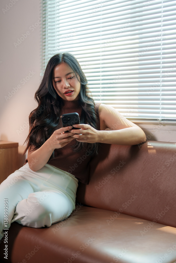 Young asian woman is using smartphone while sitting on comfortable sofa in living room near window with blinds, enjoying online communication or browsing internet