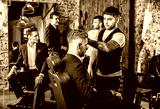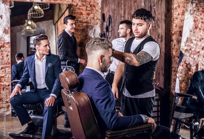 Group of young elegant positive mens pose in interior of barbershop.