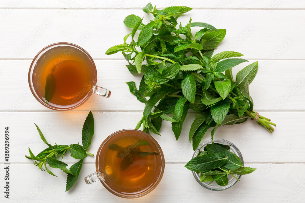 Cup of mint tea on table background. Green tea with fresh mint top view with copy space