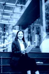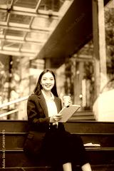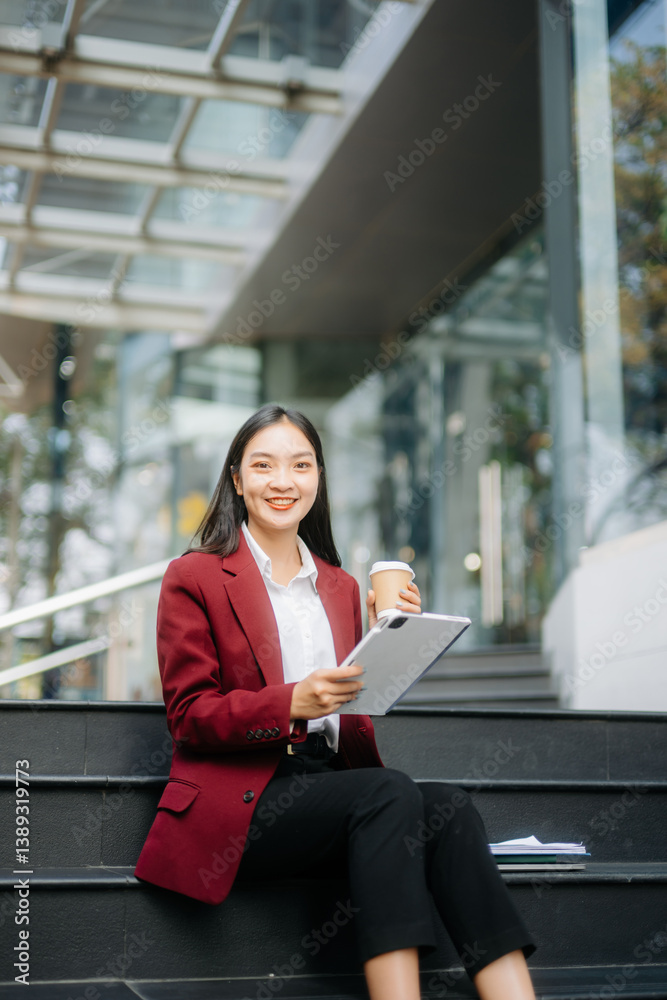 Confident Asian woman with a smile standing holding notepad and tablet at out side office.
