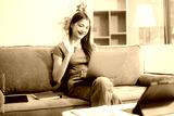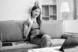 Young asian woman using smartphone and tablet while seated on couch at home