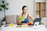 Woman enjoys a fresh salad with fruits and juice, embodying wellness, nutrition, and vitality
