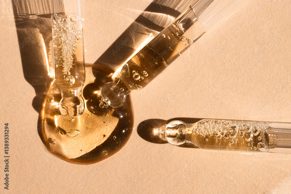 Three droppers with essential oil on beige background with sunlight, top view.