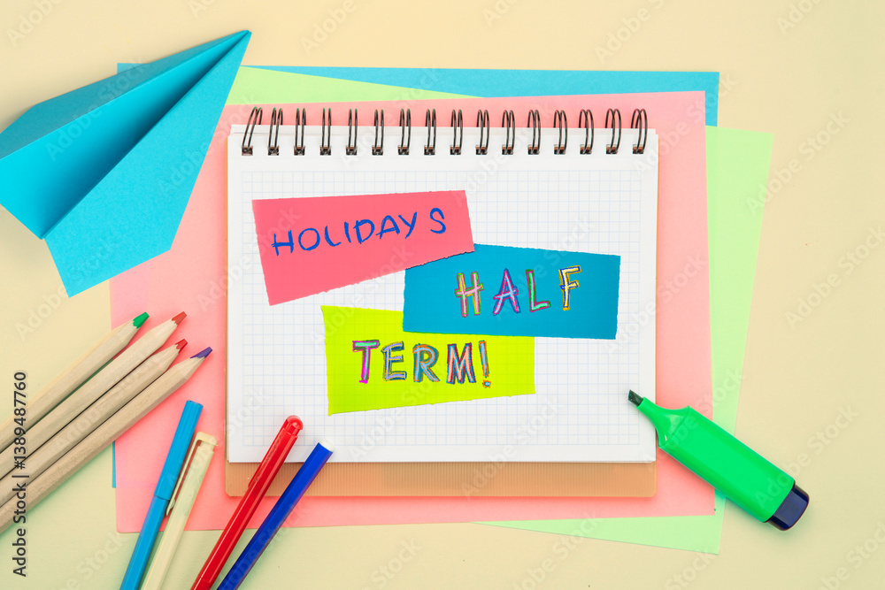School Holidays concept. Fun colorful inscriptions in a children's style. Notepads, notebooks, textbooks, school stationery