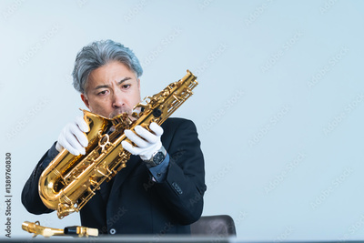 サックスを確認するミドルエイジ男性 鑑定士・リペアマン・楽器職人
