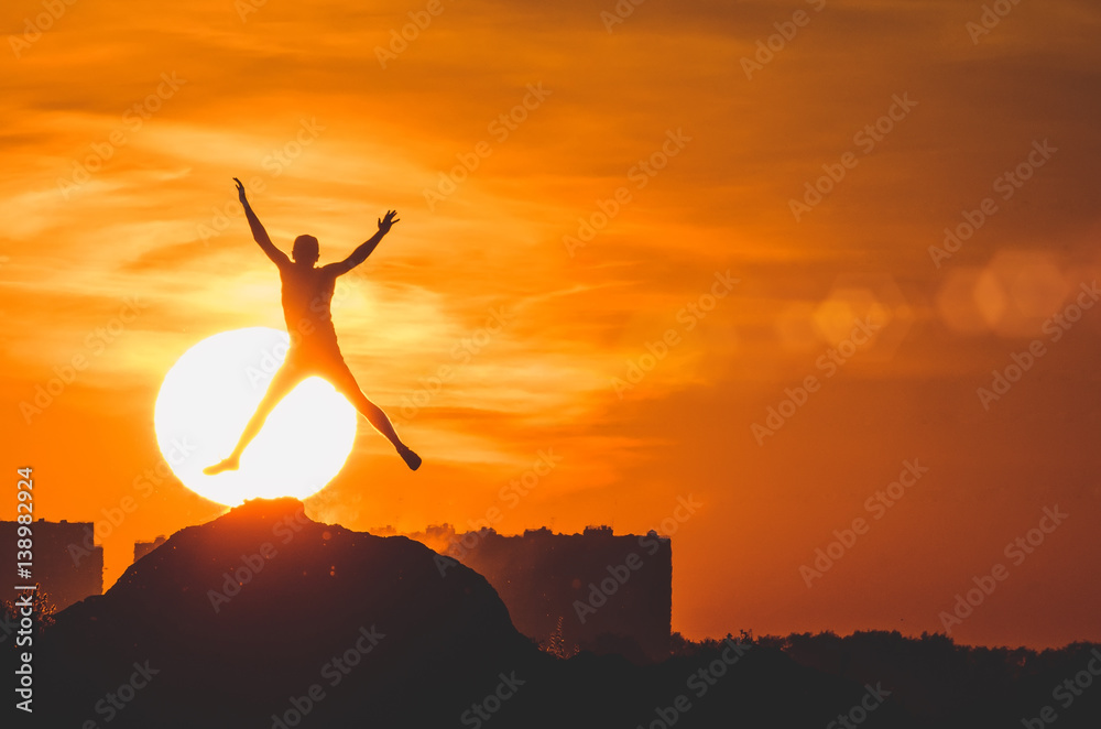 Human silhouette jumping at solar disk sunny summer sunset drive holidays and vacations