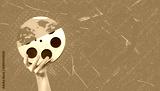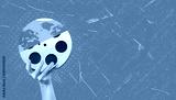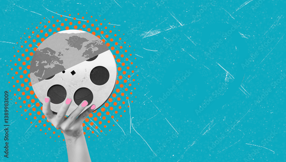 Modern art collage of a planet and movie film set against a blue background with copy space.