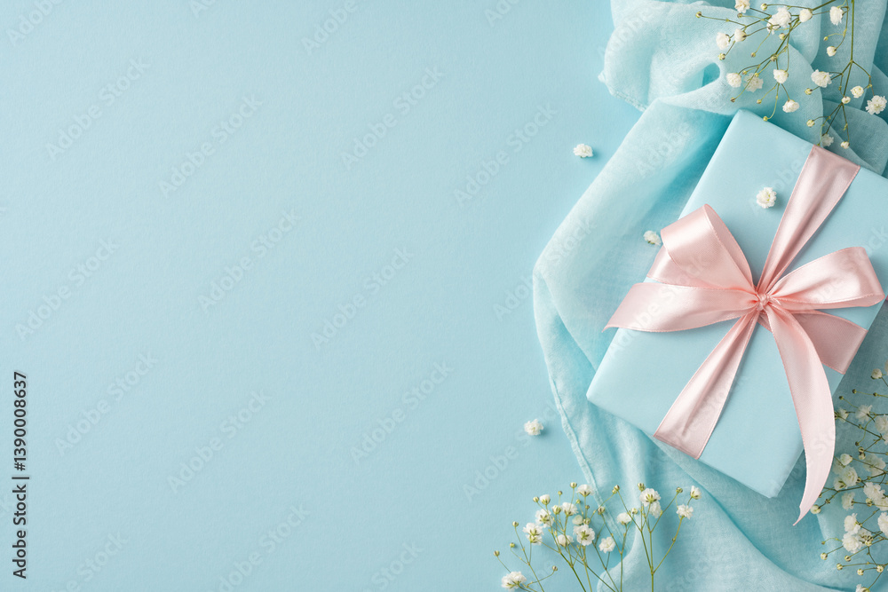 Beautifully wrapped light blue gift box with satin ribbon, accompanied by delicate floral accents