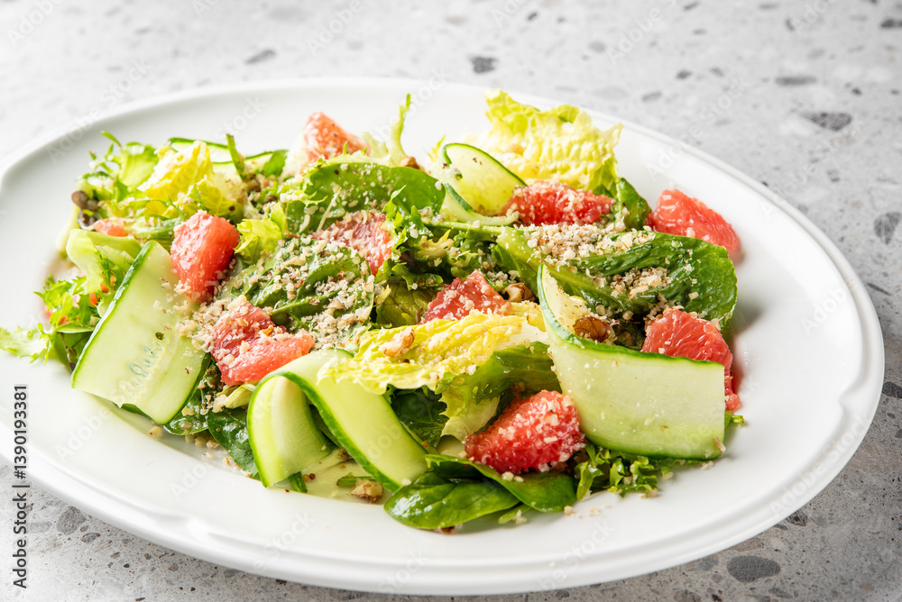A refreshing salad featuring crisp greens, vibrant grapefruit segments, and sliced cucumbers, topped with crunchy nuts and a sprinkle of cheese. This dish offers a perfect balance of flavors and textu