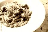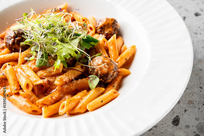 A delicious plate of pasta featuring penne, meatballs, and vibrant greens in a rich tomato sauce, elegantly presented in a white bowl against a textured background.