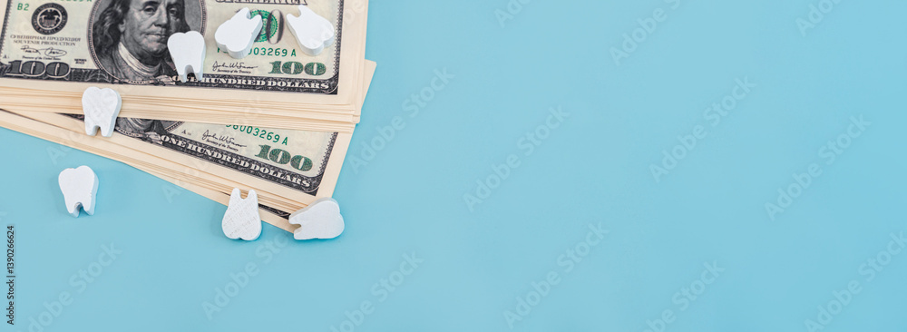 Wooden models of teeth on dollar bills on an isolated blue background, the concept of insurance, paid dental treatment and implantology.