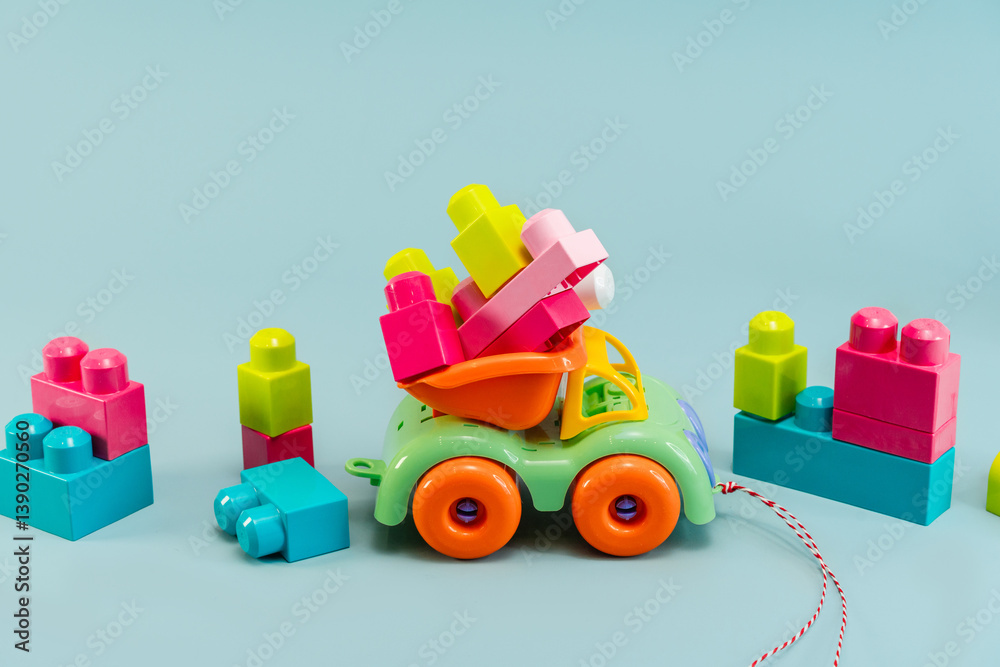 A toy truck with construction blocks in the back on an isolated background, a place for text