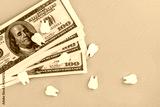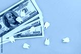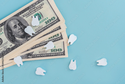 Wooden models of teeth on dollar bills on an isolated blue background, the concept of insurance, paid dental treatment and implantology.