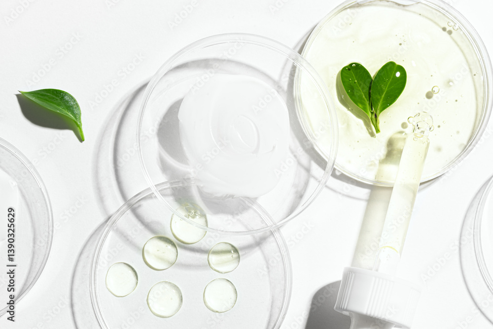 Petri dishes with green plants and gel swatches
