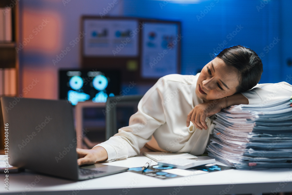 Tired doctor resting her head on a stack of documents while using a laptop, working late in the hospital