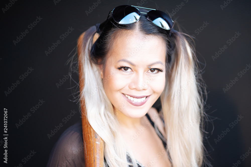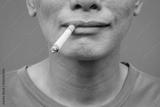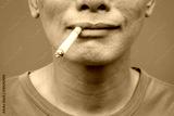 One asian man smoking on green background. Selective focus.
