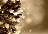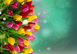 Red, violet and yellow fresh tulip flowers bouquet over green defocused background, spring festive background with fresh flowers