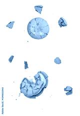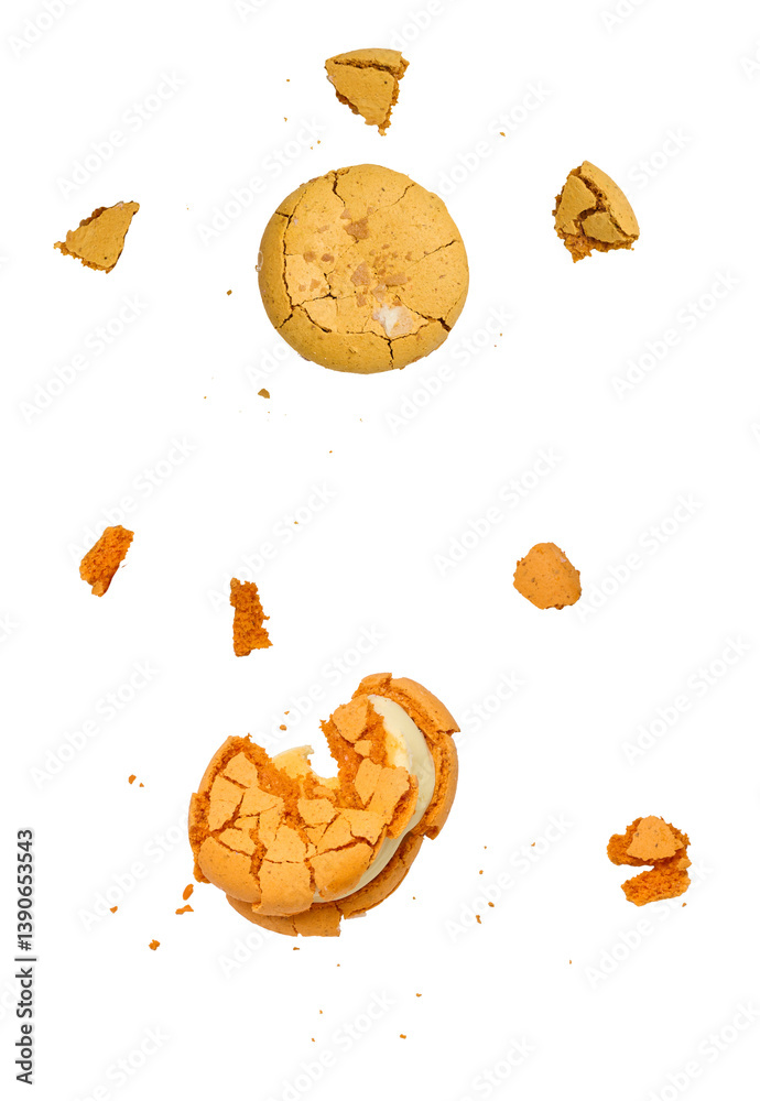 Broken macaron and several macaron pieces are scattered on isolated background.