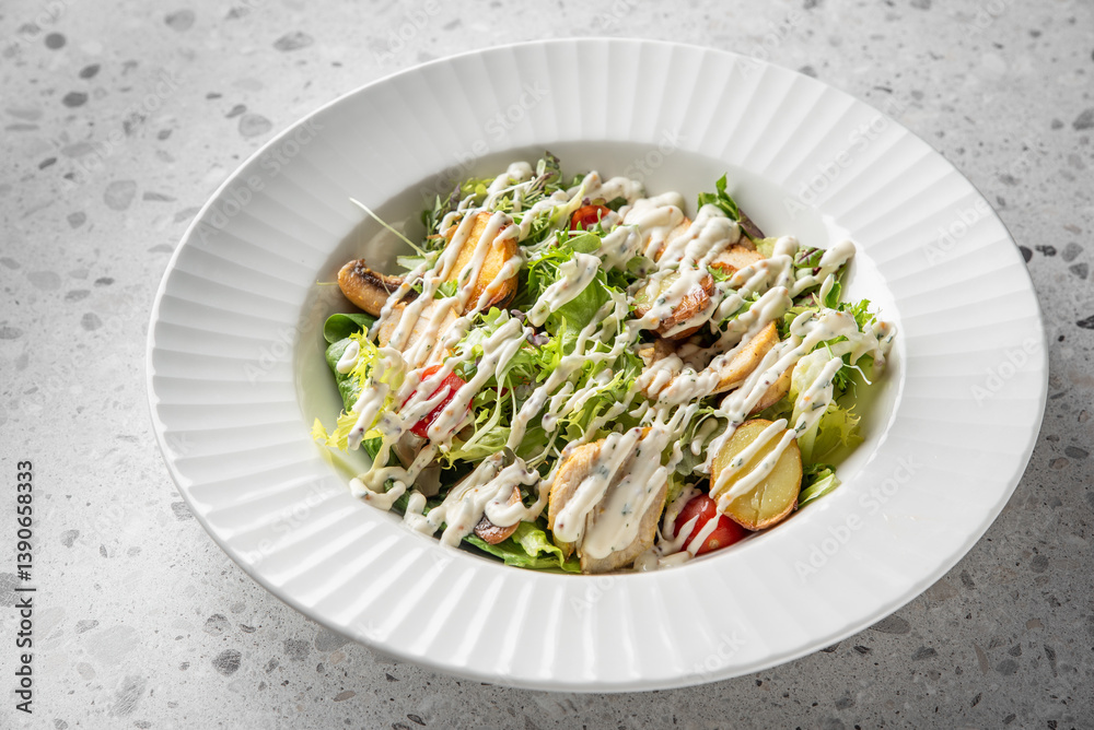A fresh salad featuring a mix of greens, cherry tomatoes, and shredded vegetables, drizzled with creamy dressing, elegantly arranged in a textured white bowl.