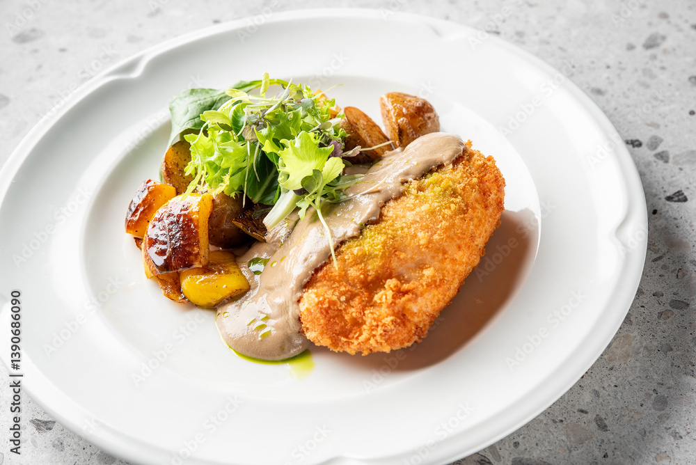 A beautifully plated dish featuring a crispy breaded chicken breast, served with sautéed potatoes, fresh greens, and a savory mushroom sauce, elegantly arranged on a white plate.