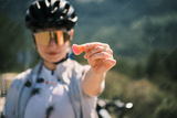 Close-up of a cyclist holding a vibrant, heart-shaped gummy candy. The blurry background emphasizes the bright colors of the treat and the cyclist's gear. Calpe,Alicante. Spain