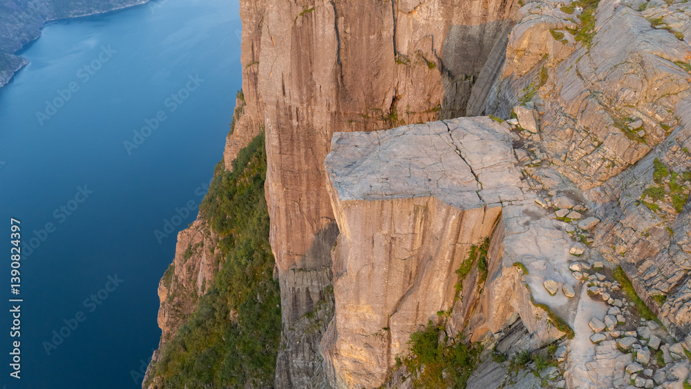 Aerial view of majestic Preikestolen cliff with rugged rock formations and dramatic elevation, Preikestolen, Norway. No people on the rock.